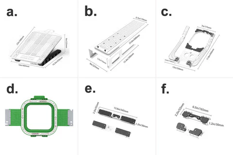 Набор HoopTalent включает: a. Основная станция x 1 b. Станция для рукавов x 1 c. Крепление M0505 x 1 d. Магнитные пяльца MaggieFrame M0505 x 1 e. Пара больших регулируемых креплений x 1 f. Пара малых регулируемых креплений x 1