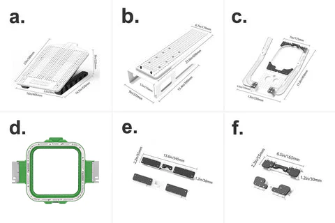 Набор HoopTalent включает: a. Основная станция x 1 b. Станция для рукавов x 1 c. Крепление M7272 x 1 d. Магнитные пяльца MaggieFrame M7272 x 1 e. Пара больших регулируемых креплений x 1 f. Пара малых регулируемых креплений x 1